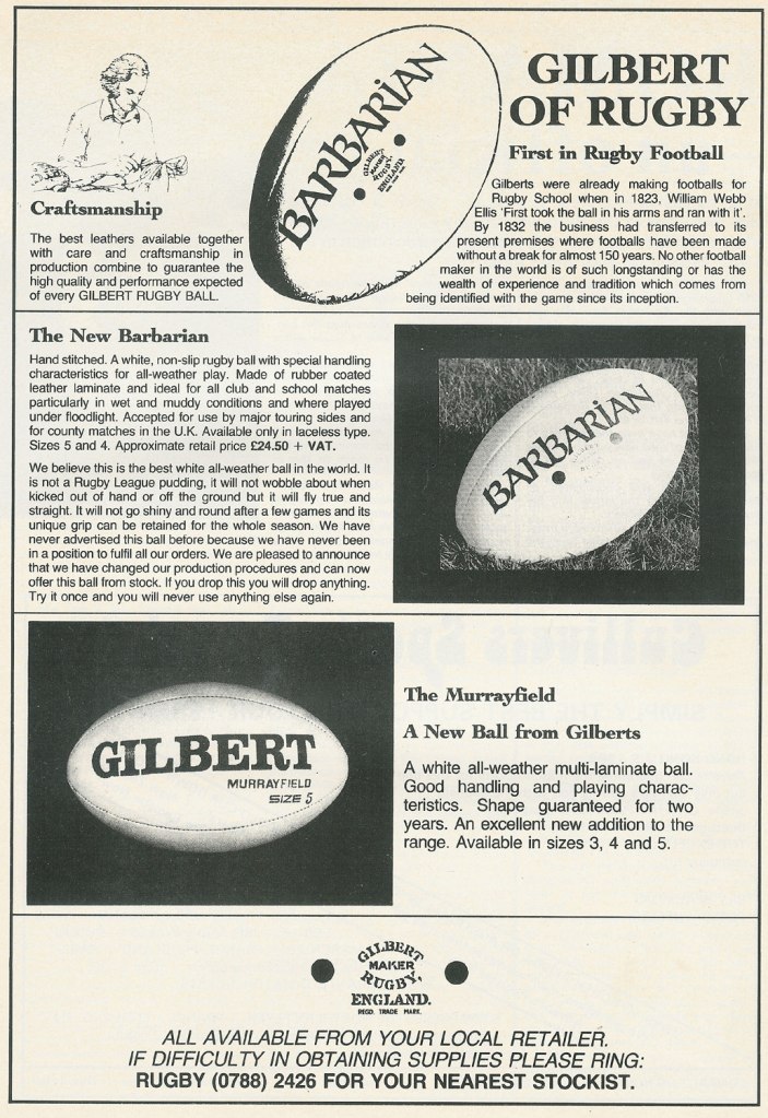 The largest change in the history of the rugby ball since Lindon’s invention came in the 1970s when traditional leather was replaced by synthetic materials1516. Leather balls were heavy and frequently became waterlogged, making them even heavier. To combat this, Mitre introduced the Multiplex ball in 1970; the synthetic ball was as much of an instant hit as you can get in a sport like rugby union. It wouldn’t be until the launch of Gilbert’s Barbarian ball in the early 1980s that the tide would change. England men used the iconic white ball for the first time in the 1981 Six Nations; the Barbarian ball featured a higher percentage of natural rubber in the outer material than the smooth Mitre ball, giving the players more grip and therefore more control. Overarching change, however, took the best part of a decade, with countries such as Wales and France still using traditional leather balls well into the 1980s, with the final usage of a leather ball in a men’s international test match taking place in 198617. The Mitre synthetic ball would become the first-ever Men’s Rugby World Cup ball a year later. Adidas would provide the ball for the Men’s Rugby World Cup in 1991 whilst Gilbert Barbarian balls would be used in the first Women’s Rugby World Cup in the same year.