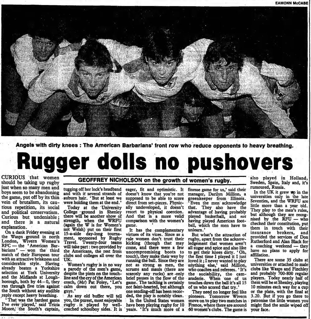 Domestic travel was not the only travel female American players undertook. American women were the first to undertake international rugby tours. American women’s rugby teams began international touring in 1977; however, in 1979, a Midwest representative side travelled to Great Britain23, ostensibly to play British teams. Unfortunately, the Midwestern side were unable to organise any matches with British sides and ended up simply playing each other. The San Diego-based Rio Grande Surfers were perhaps one of the most well-travelled teams, with documented tours to Aotearoa New Zealand and Great Britain, along with an infamous trip to Ireland thanks to a sexist ‘prank’ by male Trinity College players in 1983. International women’s rugby had begun in 1982, but was confined to Western Continental Europe with infrequent, one off games. The Wiverns24 of 1985 were the first women’s American representative side, although not officially recognised by USA Rugby. Touring Great Britain, in agreement with the Women’s Rugby Football Union25, as well as France, the Wiverns tour not only showed European rugby fans what women’s rugby could be but also how far behind European women were. The USA side dominated their opponents during their two-week tour, and the games made national newspapers in Britain.
